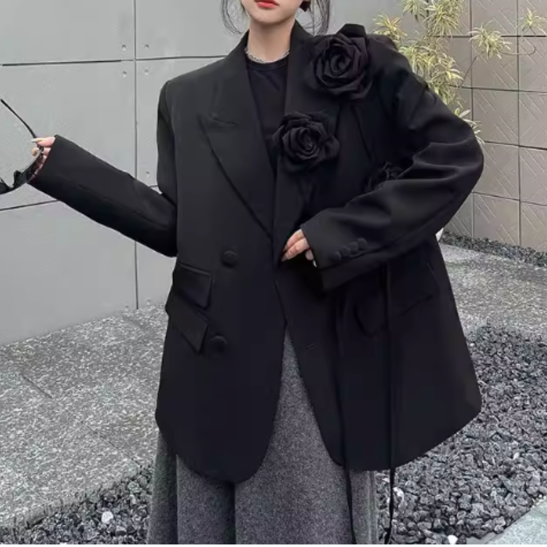 Elevate your casual style with our 3D Floral Embellished Black Blazer. Featuring a sophisticated notched lapel and stylish double-breasted closure, this long-sleeve piece combines elegance with a relaxed fit. The exquisite 3D floral embellishments add a unique touch, making it perfect for both casual outings and stylish gatherings. Crafted for comfort and designed to stand out, this blazer is an essential addition to your wardrobe, ensuring you look chic and feel confident wherever you go!