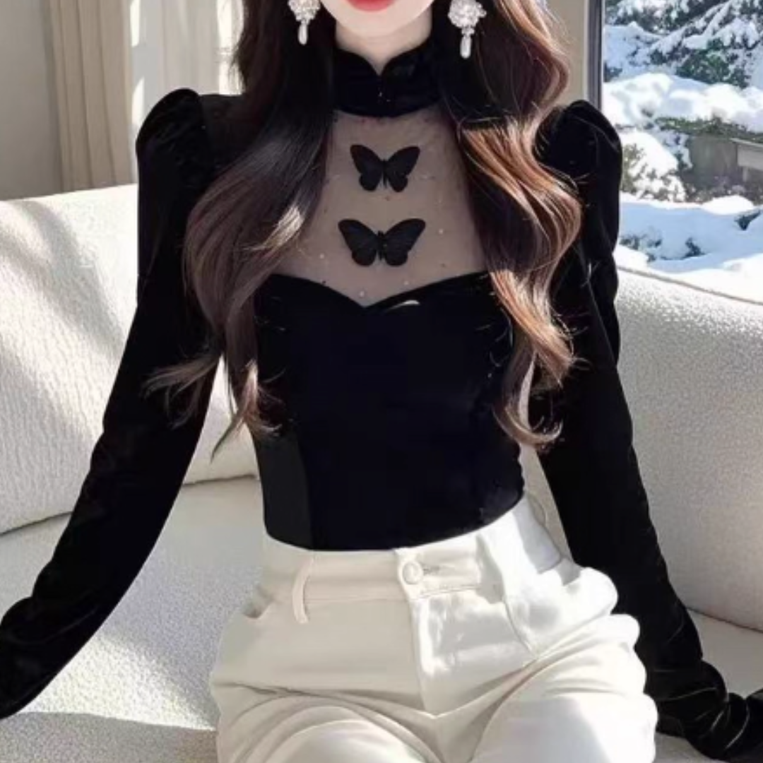 STAND COLLAR FITTED VELVET LONG SLEEVE TOP #7962